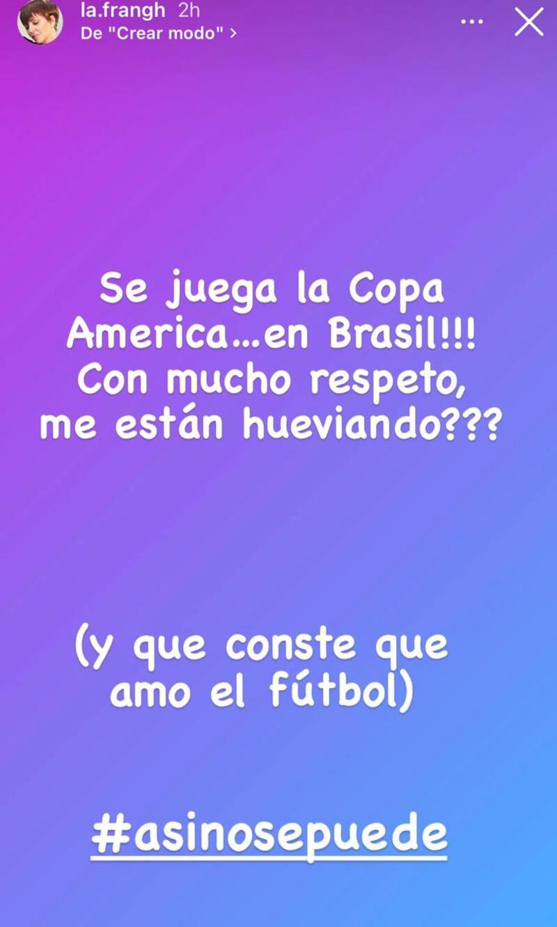 "Se juega la Copa América en Brasil. Con mucho respeto…¿me están hue…? (Y que conste que amo el fútbol) #Asínosepuede", escribió la "Dama de hierro" en sus historias de Instagram.