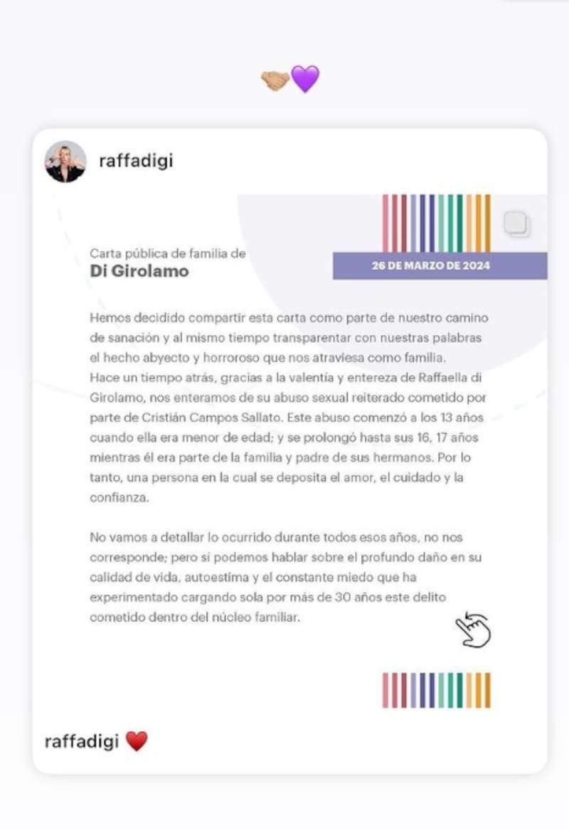 A través de redes sociales, la joven intérprete nacional (sobrina de Claudia di Girolamo e hija de Paolo di Girolamo) compartió la publicación de su prima Raffaella, en la que aparecía la carta que escribió la familia Di Girolamo.