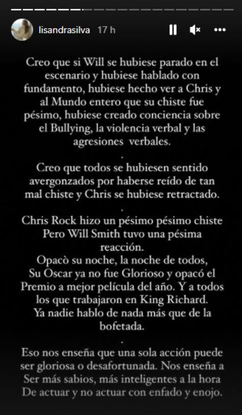 La ex chica reality Lisandra Silva utilizó sus redes sociales para referirse a la polémica que generó tras entregar su visión luego del conflicto entre Will Smith y Chris Rock en los Premios Oscar, donde se llenó de críticas.