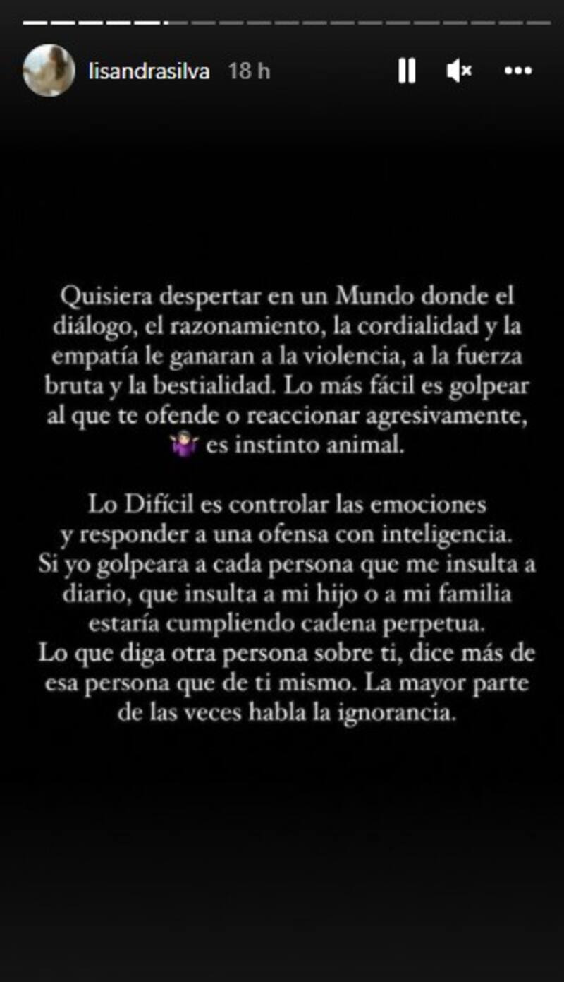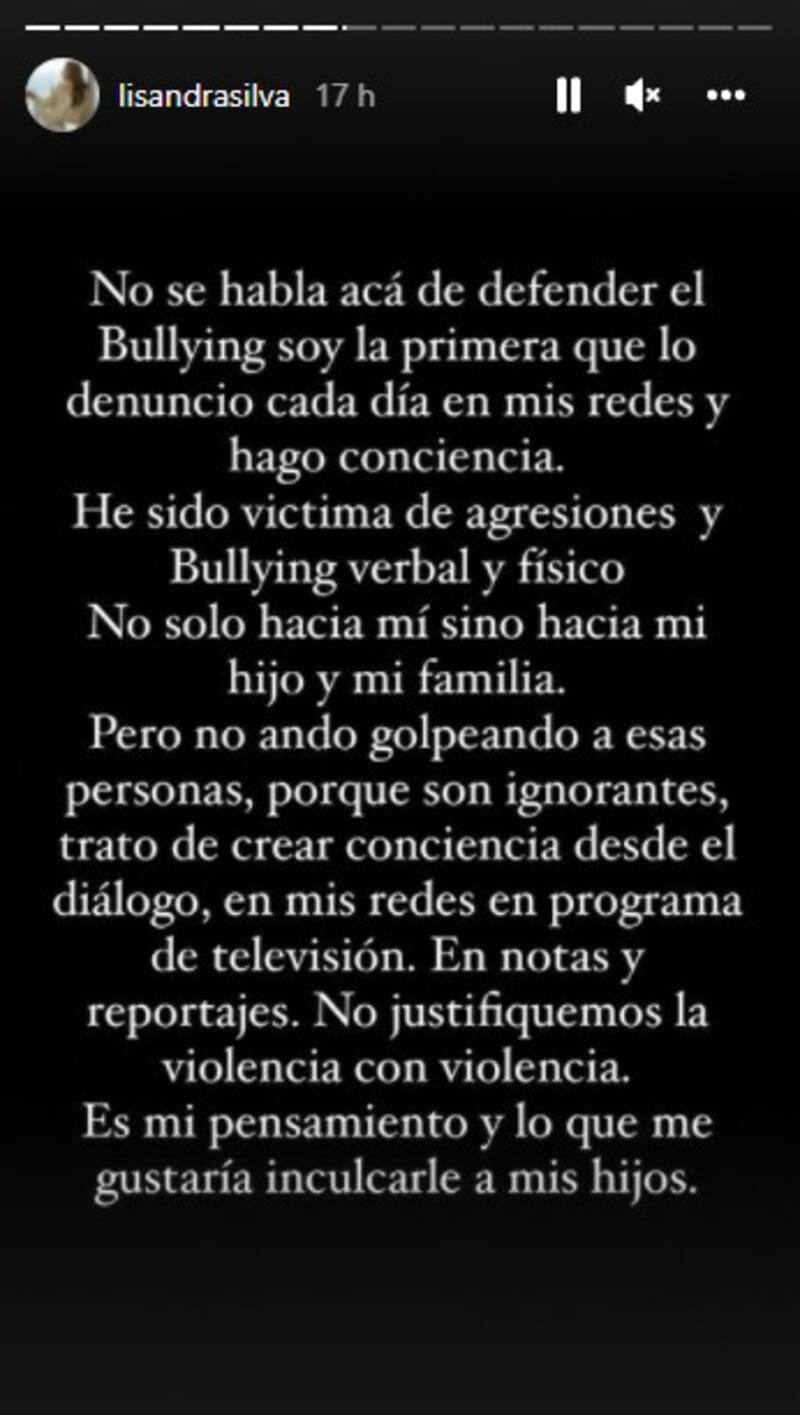 “No se habla acá de defender el bullying, soy la primera que lo denuncio cada día en mis redes y hago conciencia. He sido víctima de agresiones y bullying verbal y físico, no solo hacia mí, sino hacia mi hijo y mi familia. Pero no ando golpeando a esas personas, porque son ignorantes, trato de crear conciencia en programa de televisión. En notas y reportajes. No justifiquemos la violencia con violencia. Es mi pensamiento y lo que me gustaría inculcarles a mis hijos”, añadió.