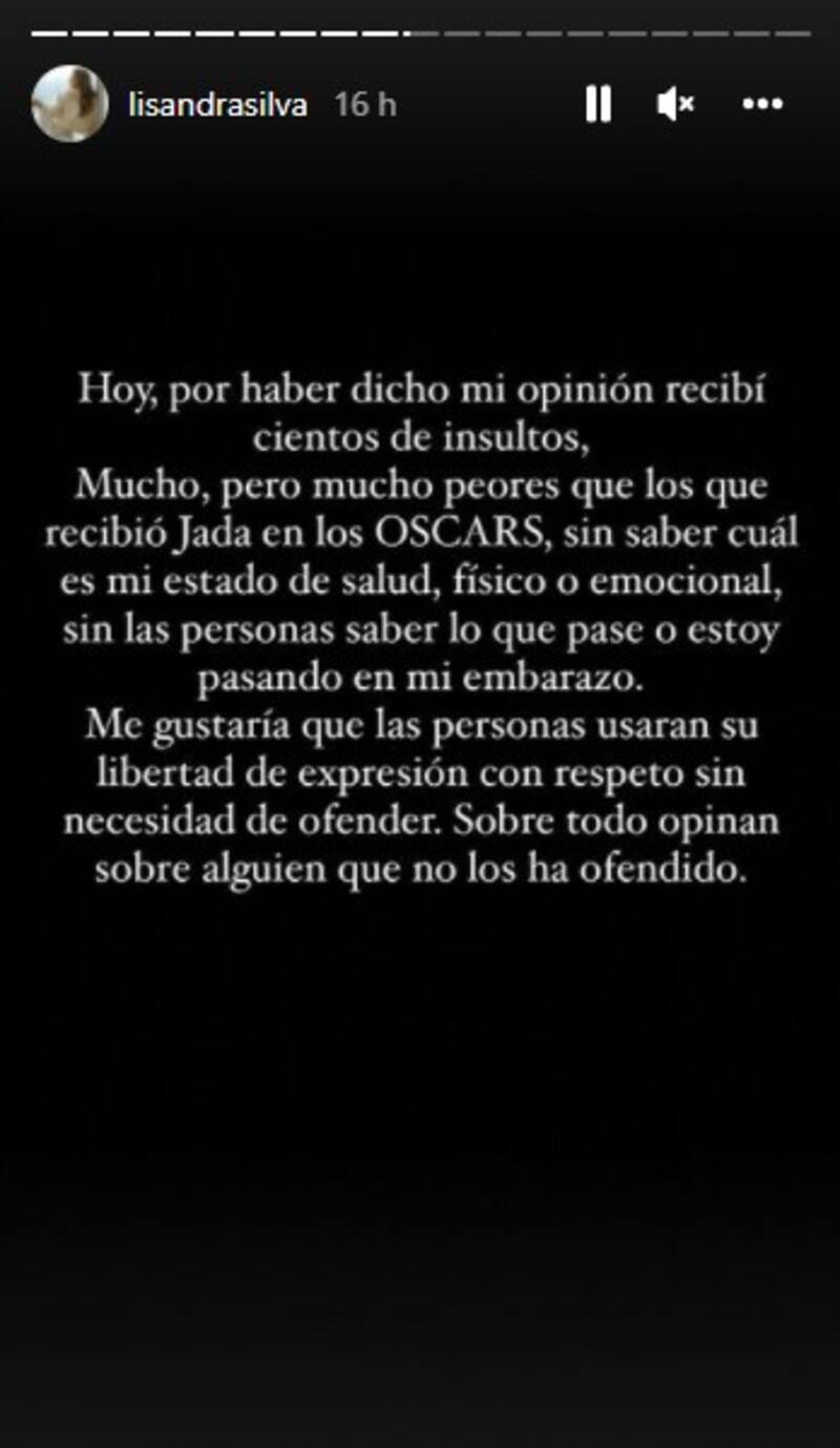 “Por haber dicho mi opinión recibí cientos de insultos. Mucho, pero mucho peores que los que recibió Jada en los Oscars, sin saber cuál es mi estado de salud, físico o emocional, sin las personas saber que estoy pasando en mi embarazo. Me gustaría que las personas usaran su libertad de expresión con respeto, sin necesidad de ofender. Sobre todo opinan sobre alguien que no los ha ofendido”, agregó generando diversas reacciones.