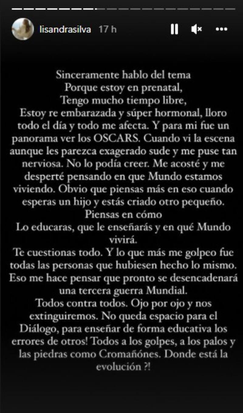 “Sinceramente hablo del tema porque estoy en prenatal, tengo mucho tiempo libre, estoy re embarazada y super hormonal, lloro todo el día y todo me afecta y para mí fue un panorama ver los OSCARS. Cuando vi la escena aunque les parezca exagerado sude y me puse tan nerviosa. No lo podía creer. Me acosté y desperté pensando en qué mundo estamos viviendo”, explicó Lisandra Silva.