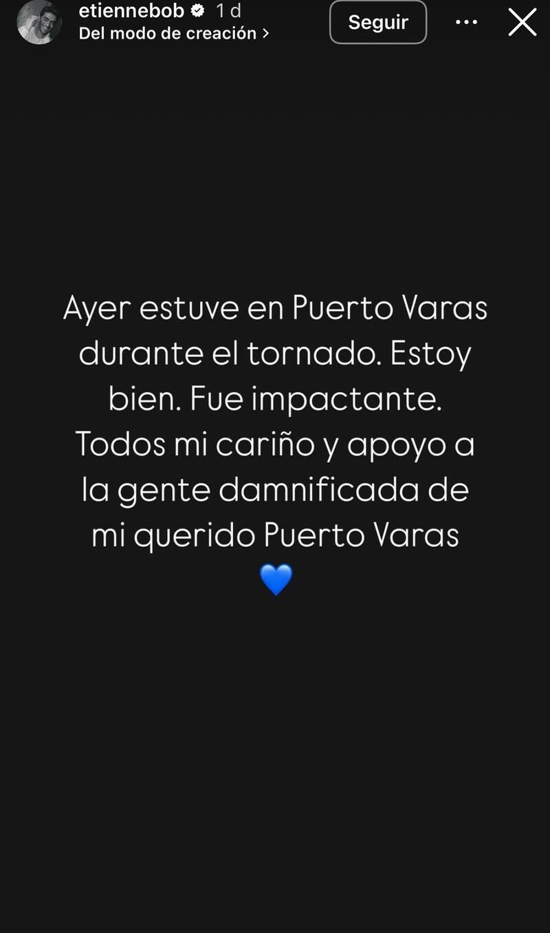 “Ayer estuve en Puerto Varas durante el tornado. Estoy bien. Fue impactante. Todo mi cariño y apoyo a la gente damnificada de mi querido Puerto Varas”, escribió de entrada en su cuenta de Instagram.