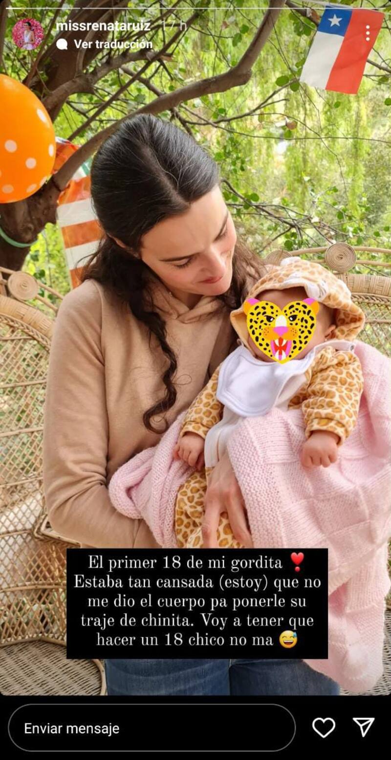 “El primer 18 de mi gordita. Estaba tan cansada (estoy) que no me dio el cuerpo pa ponerle su traje de chinita. Voy a tener que hacer un 18 chico no ma”, añadió posando con la pequeña Gala en brazos, pero cubriendo su rostro con un sticker.