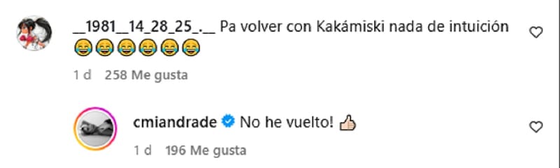 Fue en esa publicación que una usuaria la cuestionó por su supuesta reconciliación con su ex. “Pa’ volver con Kakamiski nada de intuición”, le escribió una seguidora.