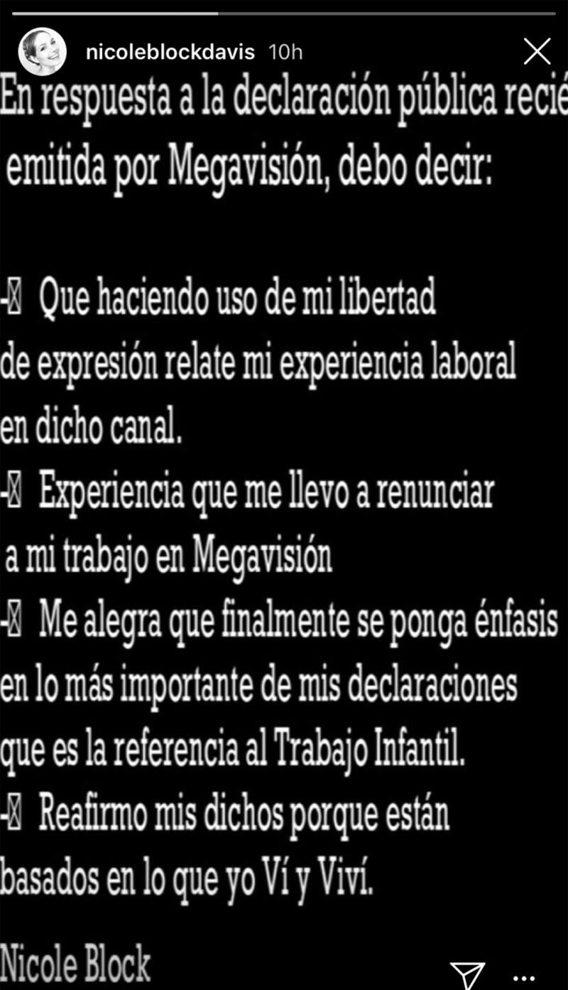 Sin embargo, el round no quedó ahí. De hecho, Nicole Block contratacó nuevamente. "Haciendo uso de mi libertad de expresión relaté mi experiencia laboral en dicho canal. Experiencia que me llevó a renunciar a mi trabajo en Megavisión (…) Me alegra que se ponga énfasis en lo más importante de mis declaraciones que es la referencia al Trabajo Infantil(...) Reafirmo miis dichos porque están basados en lo que yo vi y viví. ", se defendió.