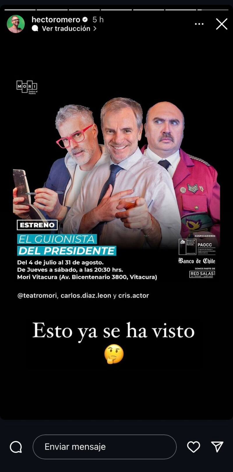 Héctor Romero, uno de los guionistas detrás de El Antídoto, compartió vía historias de Instagram las similitudes de una nueva obra de teatro y el popular sketch Los asesores del presidente, que protagonizo en El Antídoto junto a Marcelo Valverde, Luis Slimming y Karol Blum.