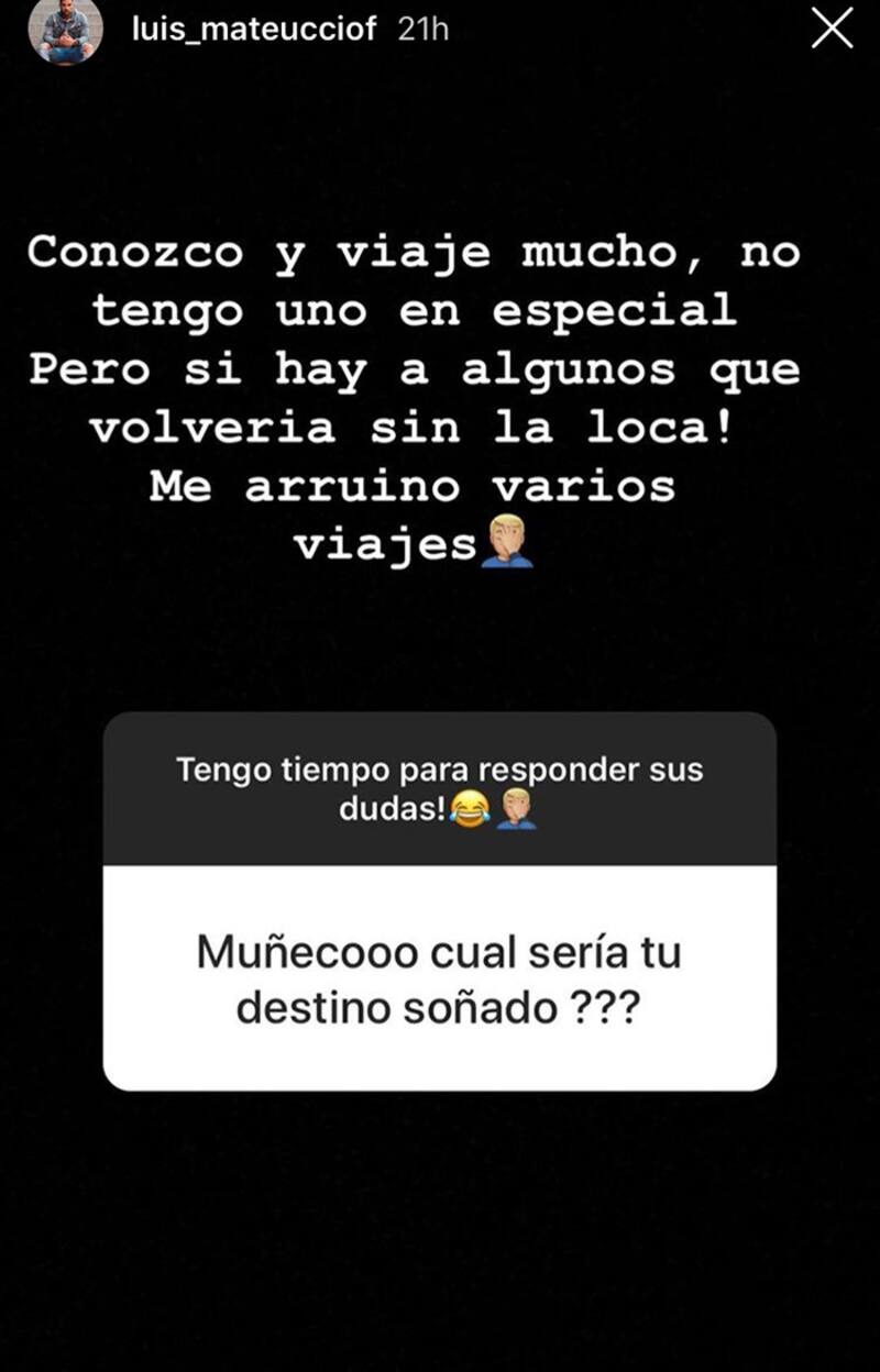 Por último, Luis también dejó mal para a Oriana cuando le preguntaron cuál era su destino soñado para viajar. "Conozco y viajé mucho, no tengo uno en especial. Pero hay algunos que volvería sin la loca. Me arruinó varios viajes", volvió a disparar sin pelos en la lengua.