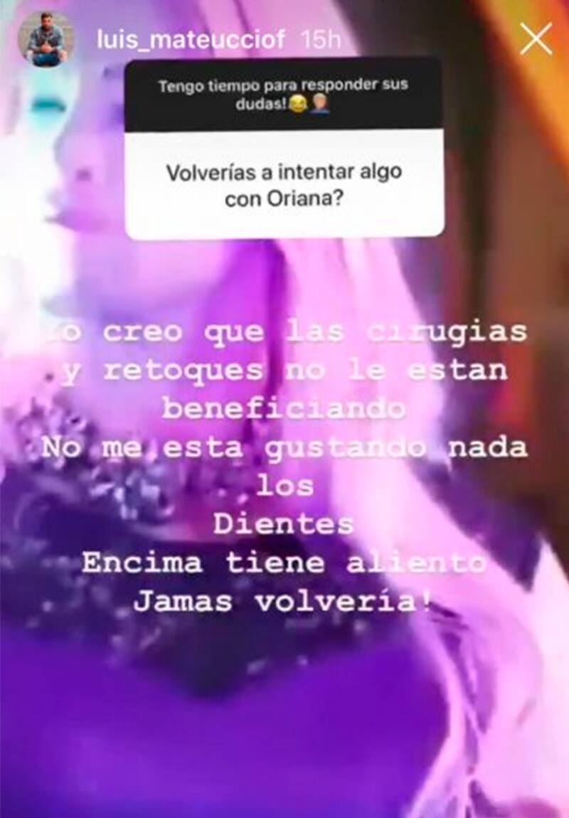 Aunque hace rato que terminaron su relación, Oriana Marzoli está lejos de ser un tema olvidado para Luis Mateucci. Así al menos lo dejó claro el argentino, quien generó revuelo tras lanzar íntimas confesiones sobre su ex pareja.