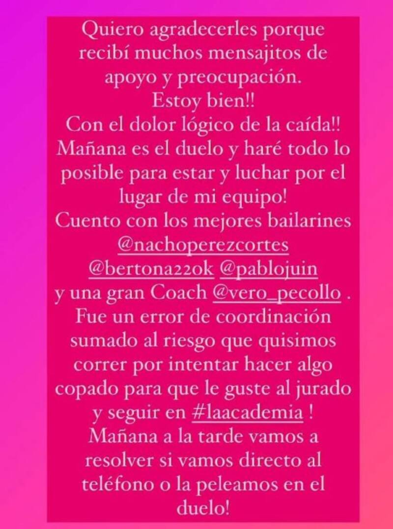 Por otro lado, usó su cuenta de Instagram para agradecer los mensajes de apoyo y preocupación que recibió de parte de sus seguidores, añadiendo que si bien está mejor, igualmente tiene los malestares lógicos de la caída.