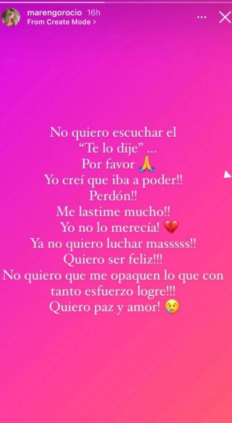 “No quiero escuchar el ‘Te lo dije’, por favor ¡Yo creí que iba a poder! ¡Perdón!”, dice la primera parte del mensaje que compartió en sus Stories.