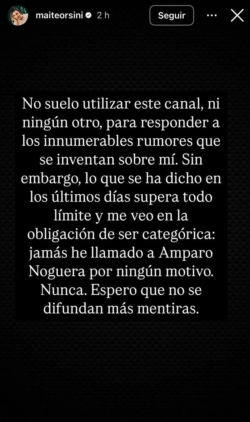 De esta forma, Maite Orsini desmintió el llamado a Amparo, pero no se refirió en concreto a su romance con Marcelo Alonso ni tampoco a la presunta infidelidad.