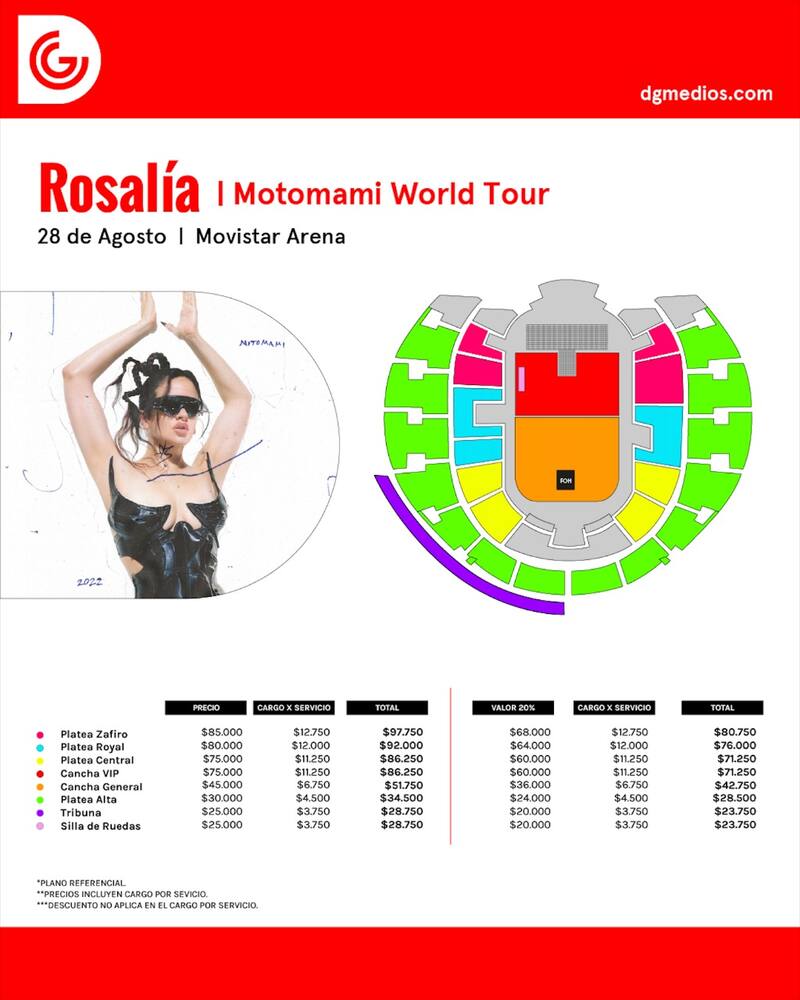 Así las cosas, Rosalía confirmó que se presentará en Santiago el próximo domingo 28 de agosto en el Movistar Arena. La preventa de los tickets para el “Motomami World Tour” comenzará este miércoles 20 de abril a las 11am con un 20% de descuento para Clientes Entel o pagando con Tarjeta Scotia Visa.