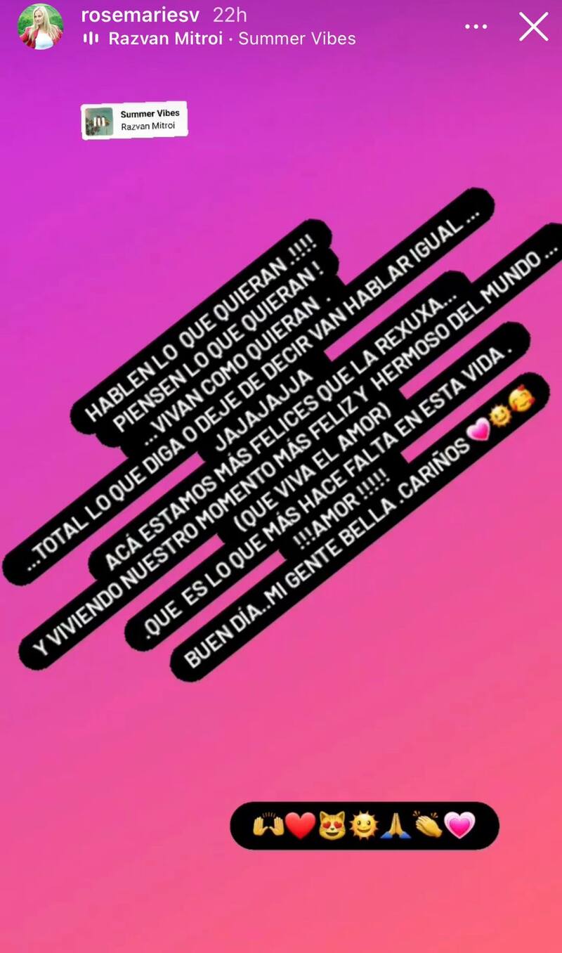 "Hablen lo que quieran!! Piensen lo que quieran!! Vivan como quieran!! Total, lo que diga o deje de decir van a hablar igual!!", escribió Rosemarie en sus historias de Instagram.