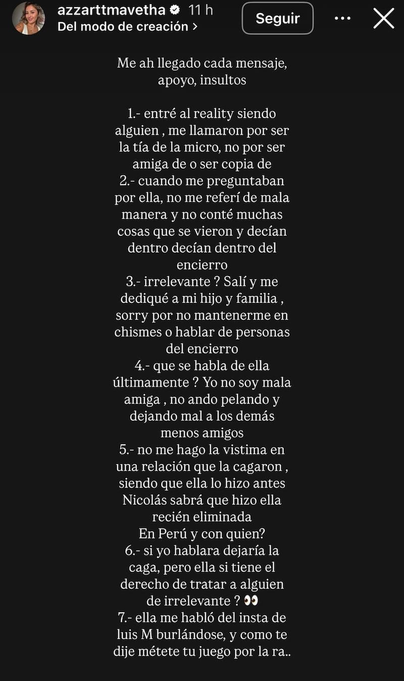 Luego, continuó: “4.- que se habla de ella últimamente ? Yo no soy mala amiga, no ando pelando y dejando mal a los demás, menos amigos. 5.- no me hago la vistima en una relación que la cag..., siendo que ella lo hizo antes, ¿Nicolás sabrá que hizo ella recién eliminada en Perú y con quien? 6.- si yo hablara dejaría la cag..., pero ella si tiene el derecho de tratar a alguien de irrelevante ? 7.- ella me habló del insta de Luis Mateucci burlándose, y como te dije métete tu juego por la ra…”.