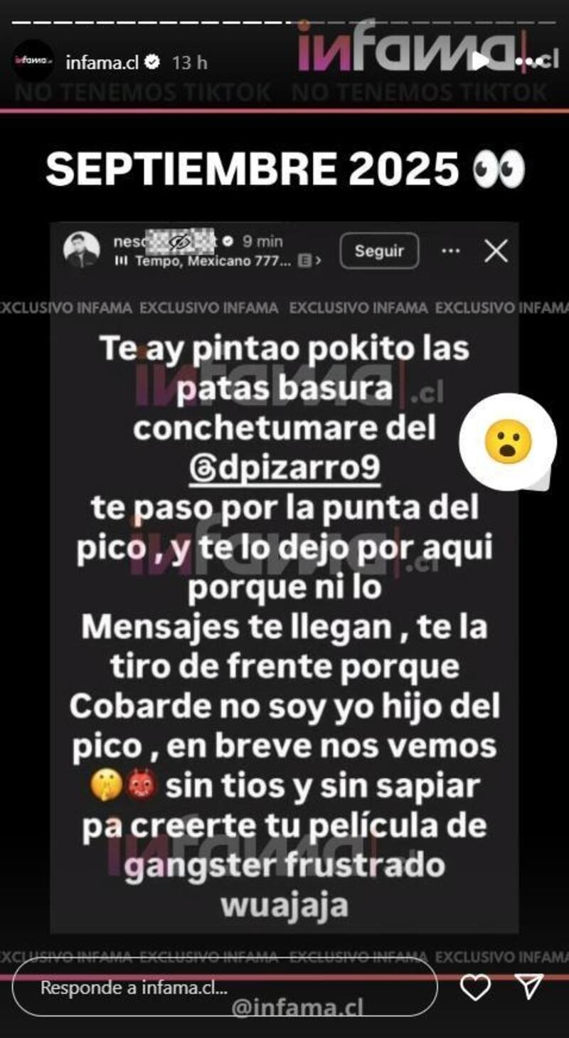 Fue en este contexto que el portal Infama difundió la imagen de una historia de Instagram de Rodríguez, en la que amenaza al futbolista Damián Pizarro, quien fue vinculado con Maira hace algunas semanas.