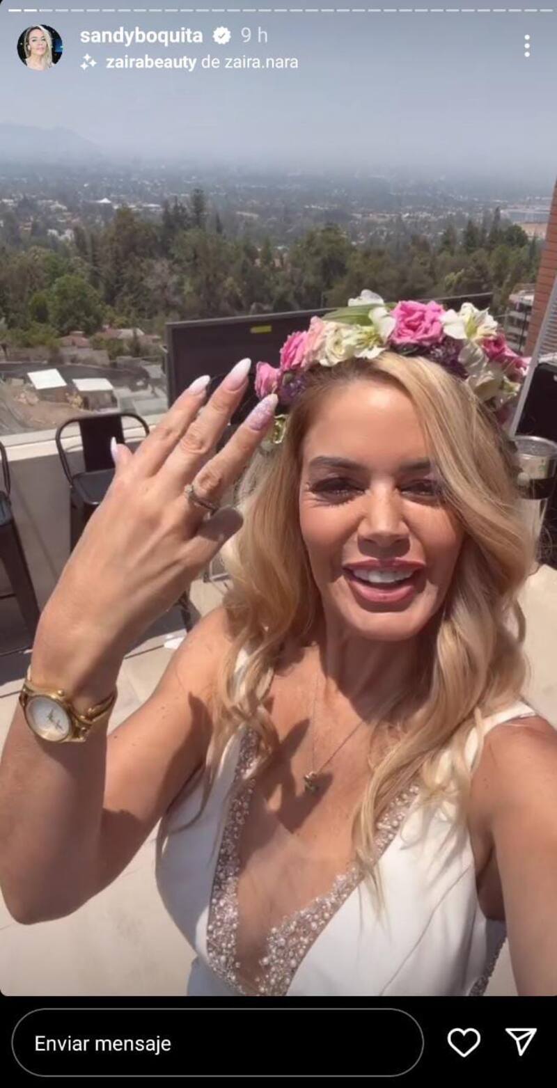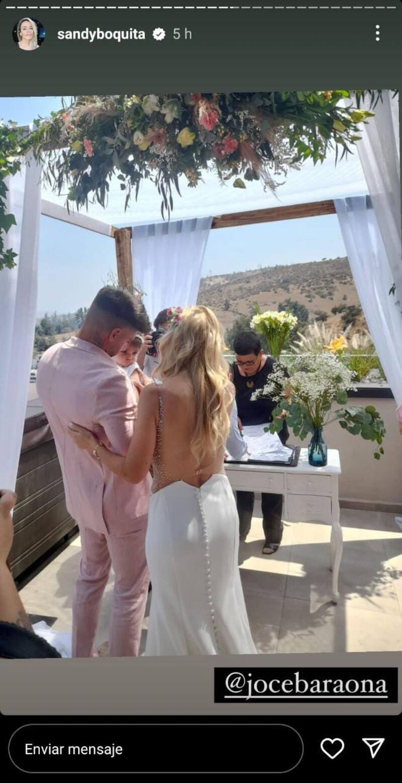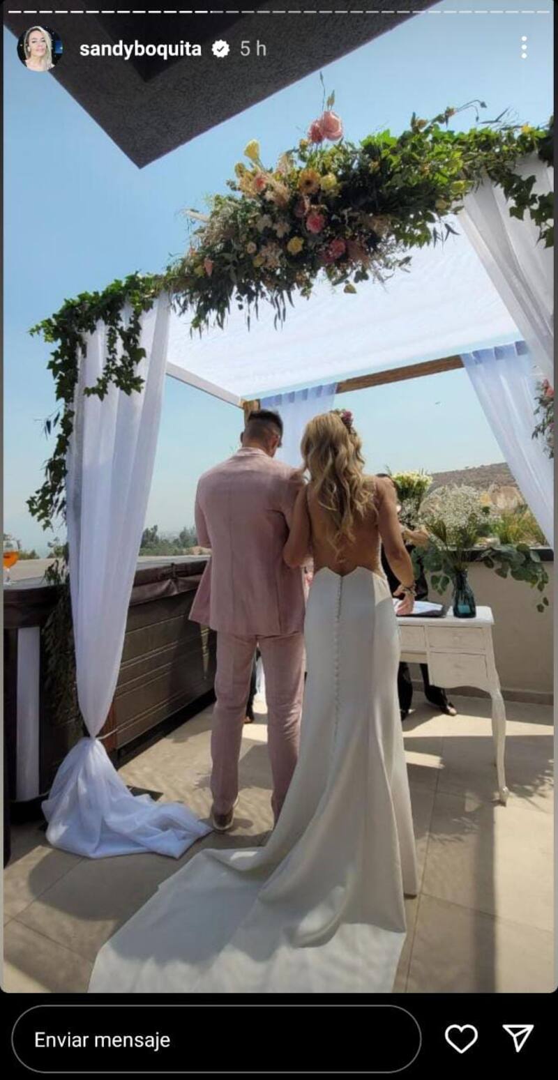 A través de sus historias de Instagram Sandy Boquita mostró su emoción tras firmar y casarse por el matrimonio civil, luciendo su vestido y anillo y posteriormente compartir registros de la fiesta.