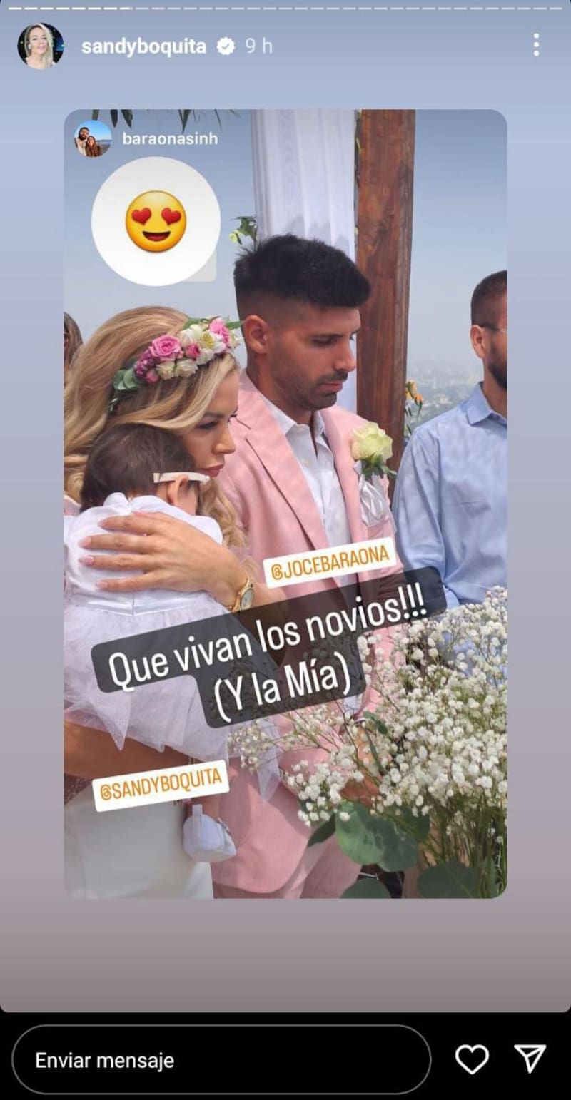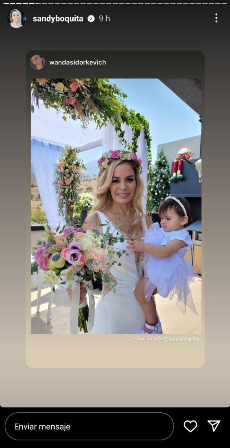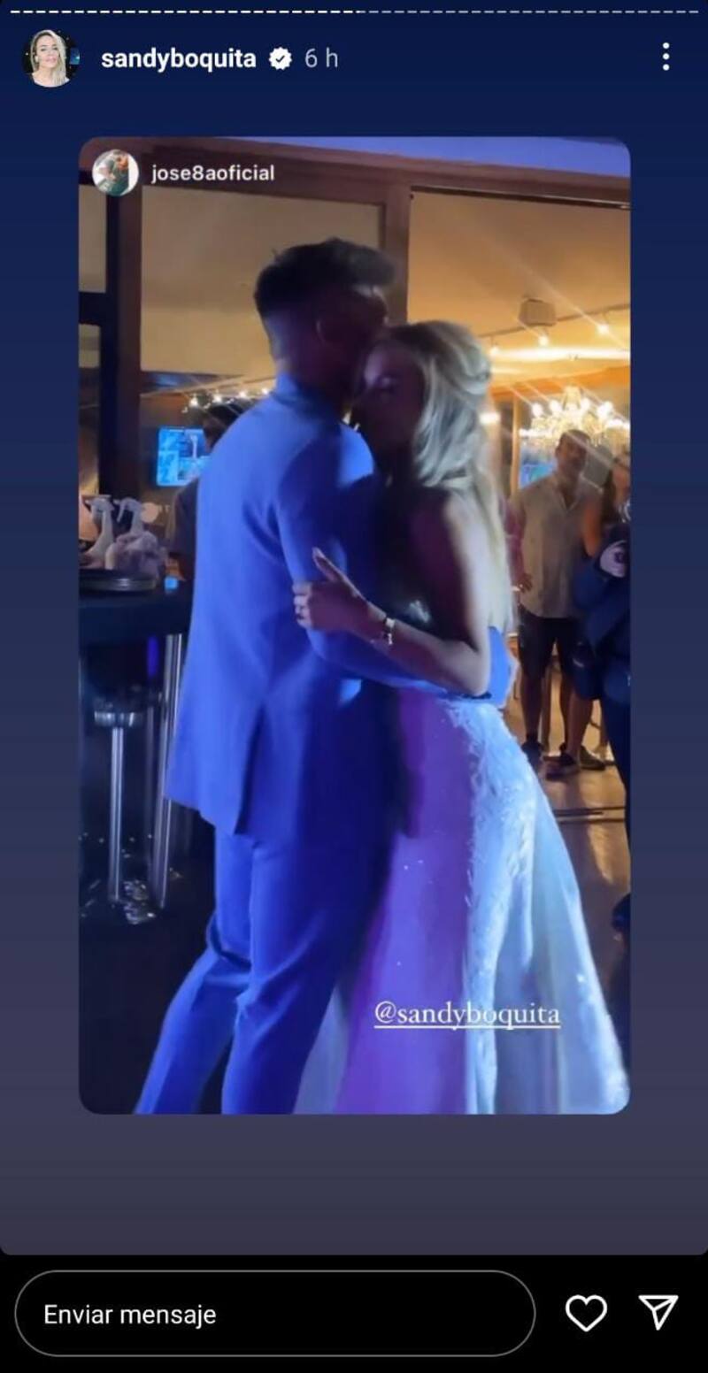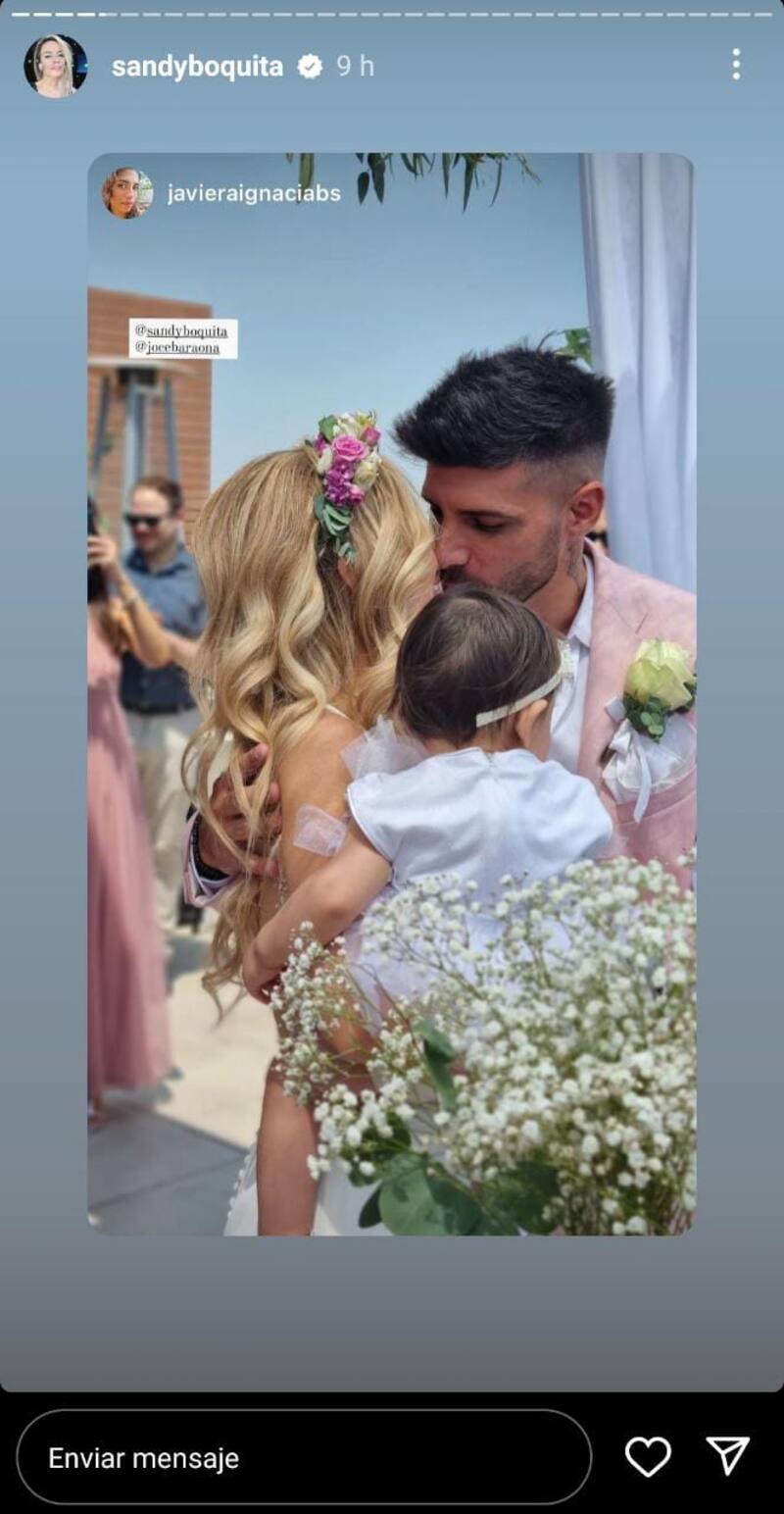 A través de sus historias de Instagram Sandy Boquita mostró su emoción tras firmar y casarse por el matrimonio civil, luciendo su vestido y anillo y posteriormente compartir registros de la fiesta.