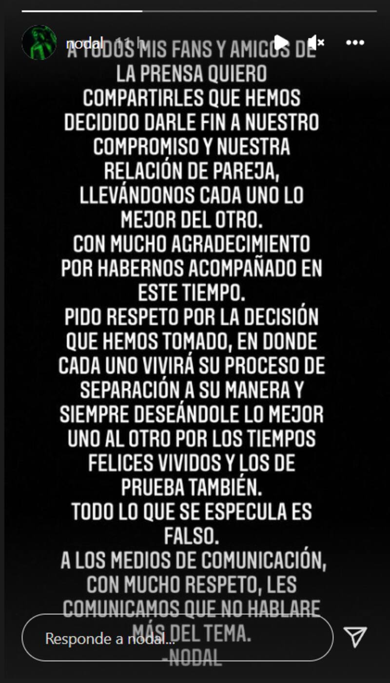 Con esas palabras el cantante comunicó la noticia a sus fanáticos. La pareja había anunciado su compromiso en mayo del año pasado, también a través de unas fotografías en las redes sociales de Nodal, las que ahora fueron eliminadas de su perfil.