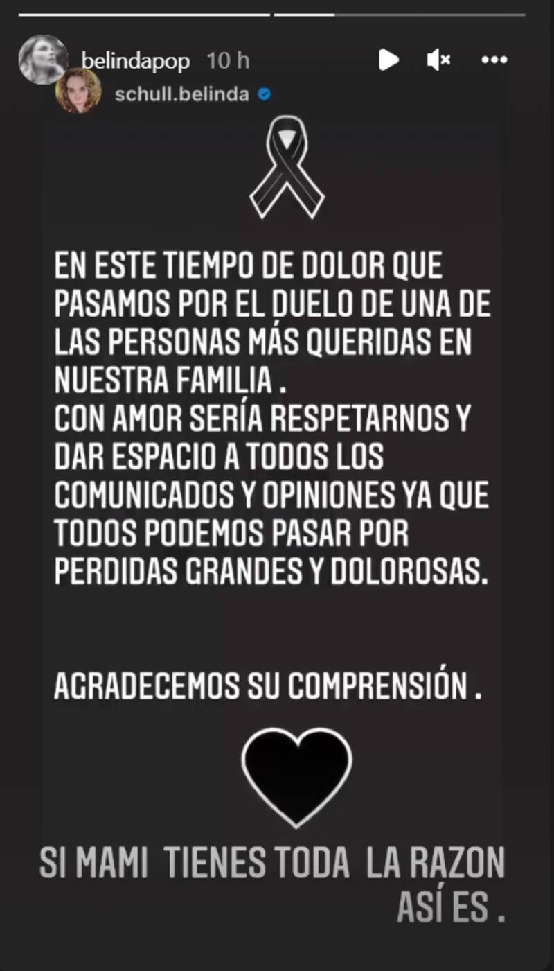 Hasta el momento Belinda no ha dado declaraciones al respecto, solamente compartió una publicación de su madre, en la cual pedía respeto por el proceso que estaban atravesando, pero este no se refería al quiebre de la relación, si no que al aniversario de la muerte de la abuela de Belinda, el 10 de febrero del año pasado.