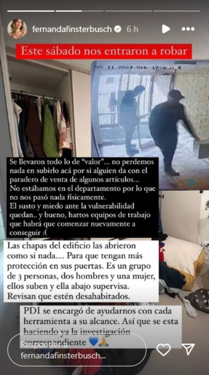 En redes sociales, Fernanda Finsterbusch denunció que sufrió un robo este fin de semana y reveló detalles sobre lo que ocurrió.