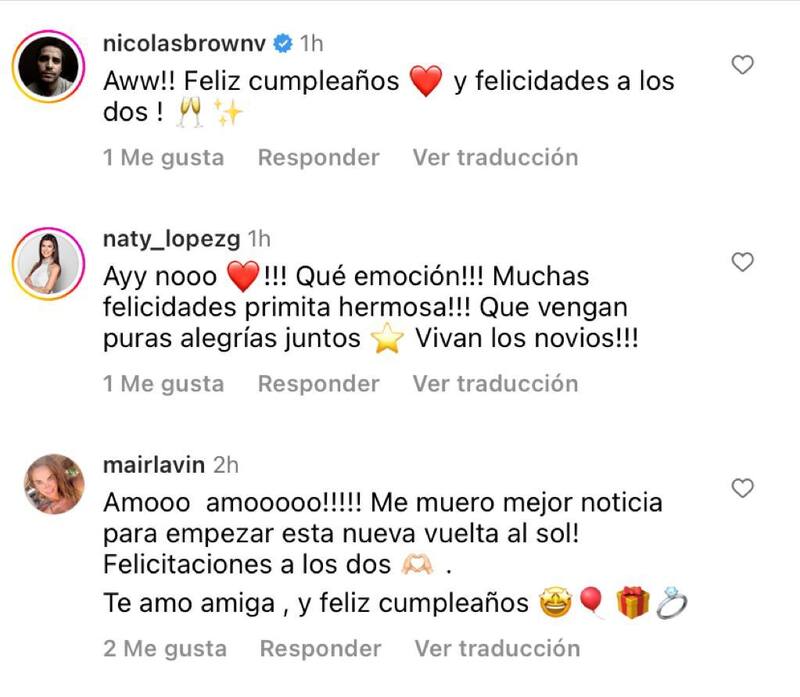 “¡Ay no! ¡Qué emoción! Muchas felicidades primita hermosa. Que vengan puras alegrías juntos ¡Vivan los novios!”; “Feliz cumpleaños y felicidades a los dos”; “¡Qué emoción! Felicidades mis preciosos, que mejor noticia”, fueron algunos de los comentarios que se ven en la publicación.