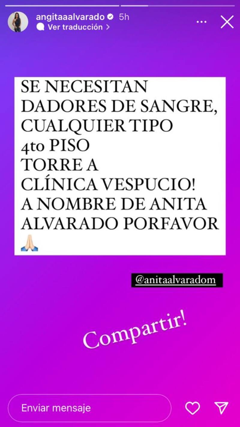 Su hija, Angie Alvarado, fue quien comunicó la situación de su madre en su cuenta oficial de Instagram, donde le pidió a sus seguidores que fueran hasta la Clínica Vespucio para donar sangre por su mamá.