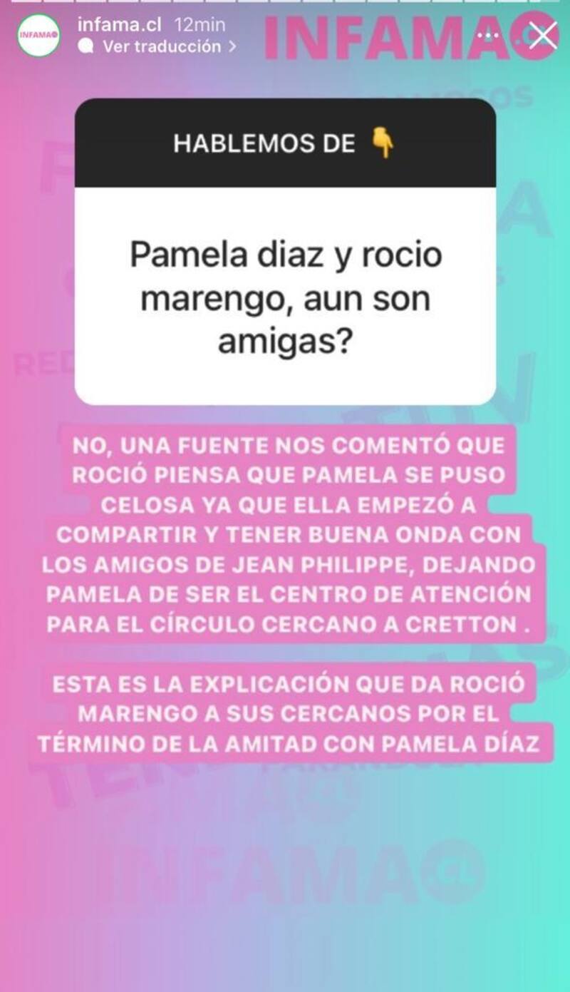 “Esta es la explicación que da Rocio Marengo a sus cercanos, por el término de la amistad con Pamela Díaz”, dijo el medio.