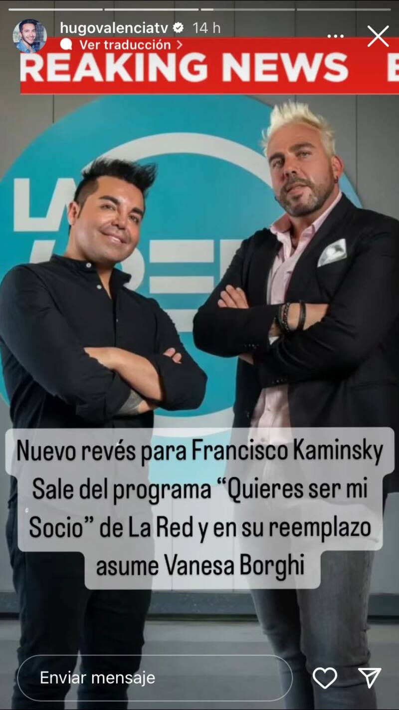 “Nuevo revés para Francisco Kaminski. Sale del programa ‘Quieres ser mi socio’ de La Red y en su reemplazo asume Vanesa Borghi”, afirmó el comunicador a través de su cuenta de Instagram.
