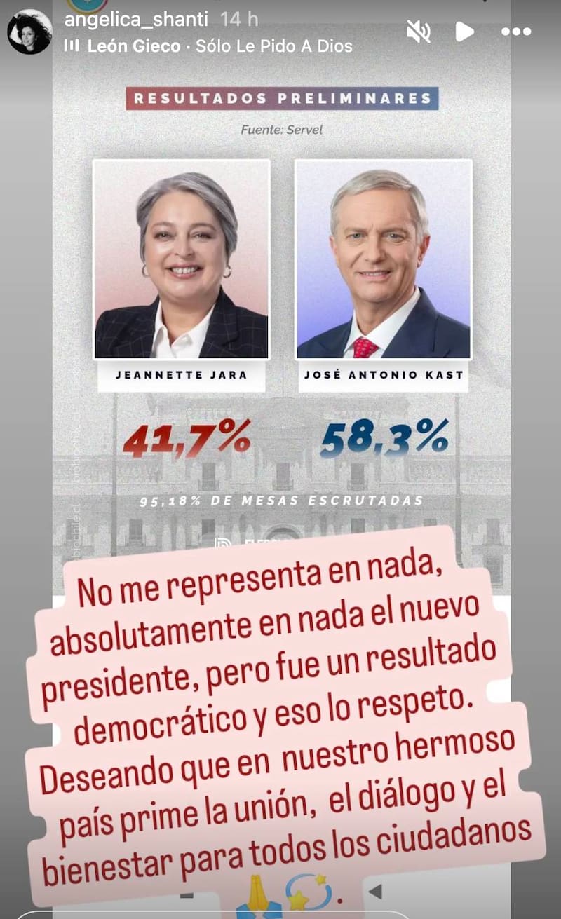 “No me representa en nada, absolutamente en nada el nuevo presidente, fue pero fue un resultado democrático y eso lo respeto”, escribió en una historia que subió a su cuenta de Instagram.