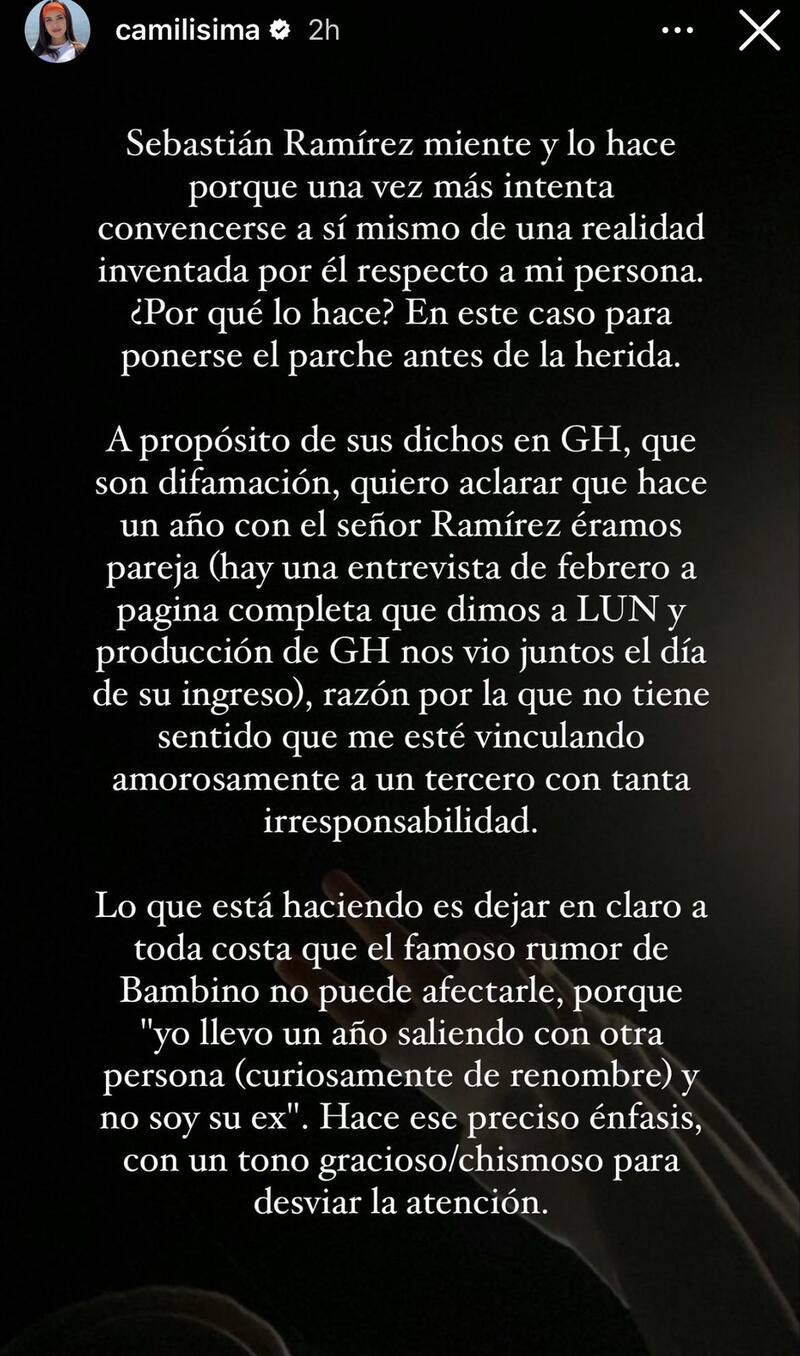“A propósito de sus dichos en GH, que son difamación, quiero aclarar que hace un año con el señor Ramírez éramos pareja (hay una entrevista de febrero a pagina completa que dimos a LUN y producción de GH nos vio juntos el día de su ingreso), razón por la que no tiene sentido que me esté vinculando amorosamente a un tercero con tanta irresponsabilidad”, complementó.