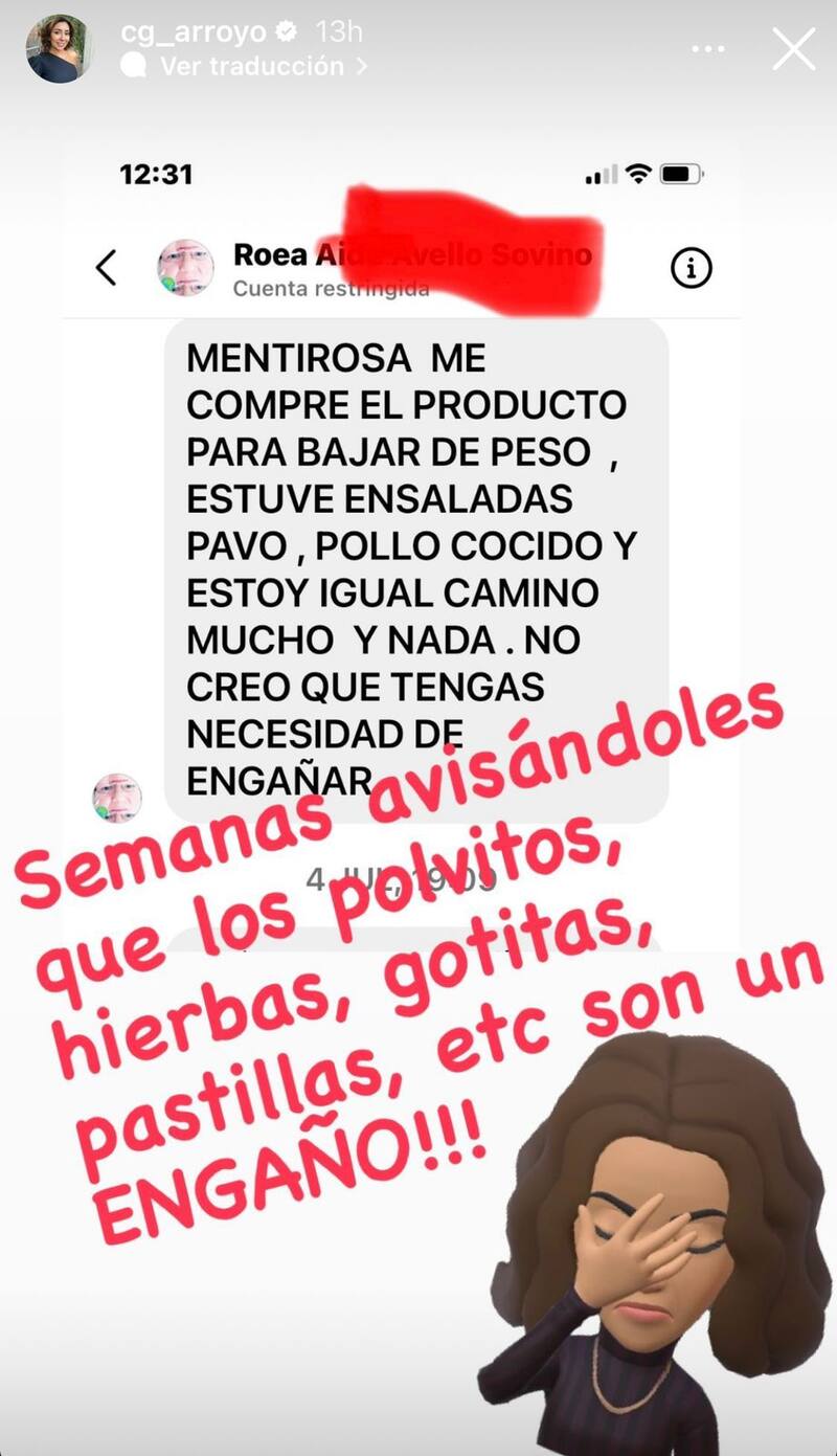 Sin embargo, Arroyo no aguantó el basureo y le respondió públicamente a la seguidora. “Semanas avisándole, que los polvitos, hierbas, gotitas, pastillas, etc., son un engaño”, escribió la storie junto a un avatar de ella tomándose la cabeza.