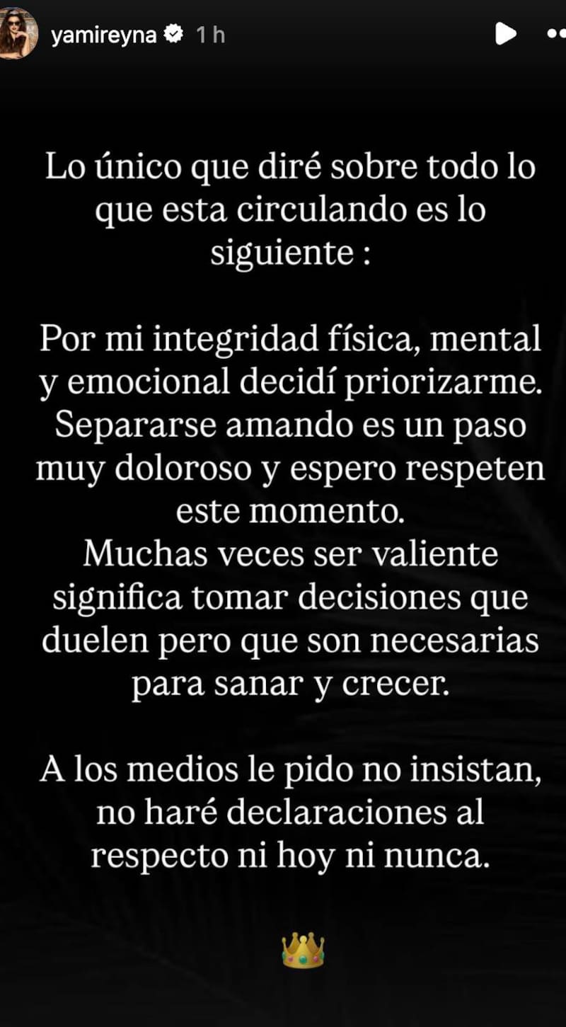 “Lo único que diré sobre todo lo que está circulando es lo siguiente: Por mi integridad física, mental y emocional decidí priorizarme. Separarse amando es un paso muy doloroso y espero respeten este momento”, expuso de entrada.