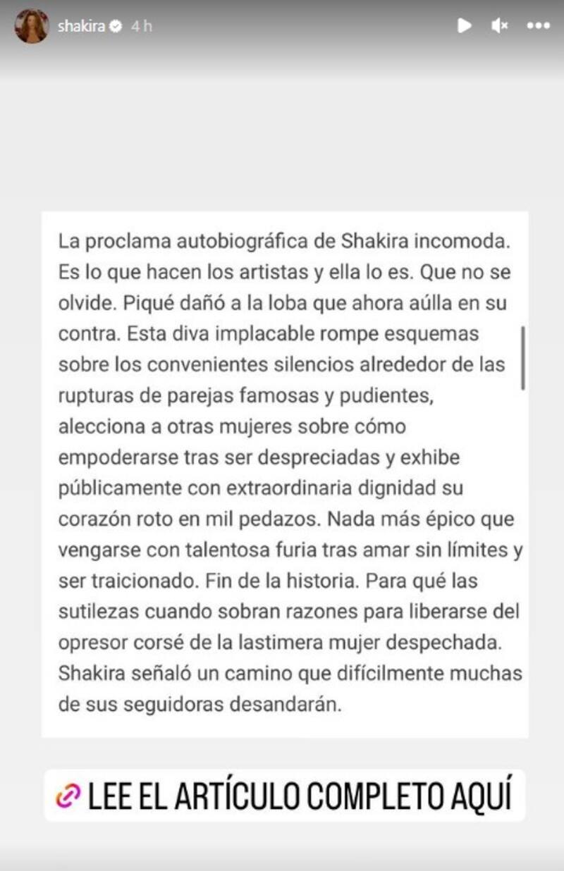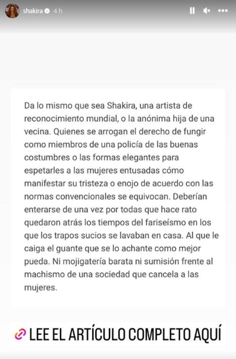 En el extracto que la cantante publicó en sus historias de Instagram, se lee: “Da lo mismo que sea Shakira, una artista de reconocimiento mundial, o la anónima hija de una vecina. Quienes se arrogan el derecho de fungir, como miembros de una policía de las buenas costumbres o las formas elegantes, para espetarles a las mujeres entusadas cómo manifestar su tristeza o enojo de acuerdo con las normas convencionales se equivocan”.