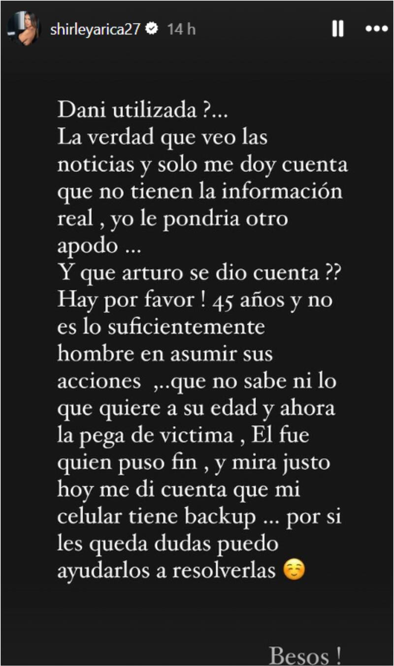 “No tengo nada que decir, no me puede importar menos”, planteó Dani en Zona de estrellas (Zona Latina). “Sólo puedo decir que ojalá ‘Futuro’ le diga a Shirley todo lo que opinaba de ella fuera del encierro, que eran “razones por las cuales le decía a Arturo (Longton) que no estuviera con ella acá afuera, que no le convenía”, arremetió; pero “si es su pareja que la cuide nomás”, redondeó sobre el nuevo pololeo.