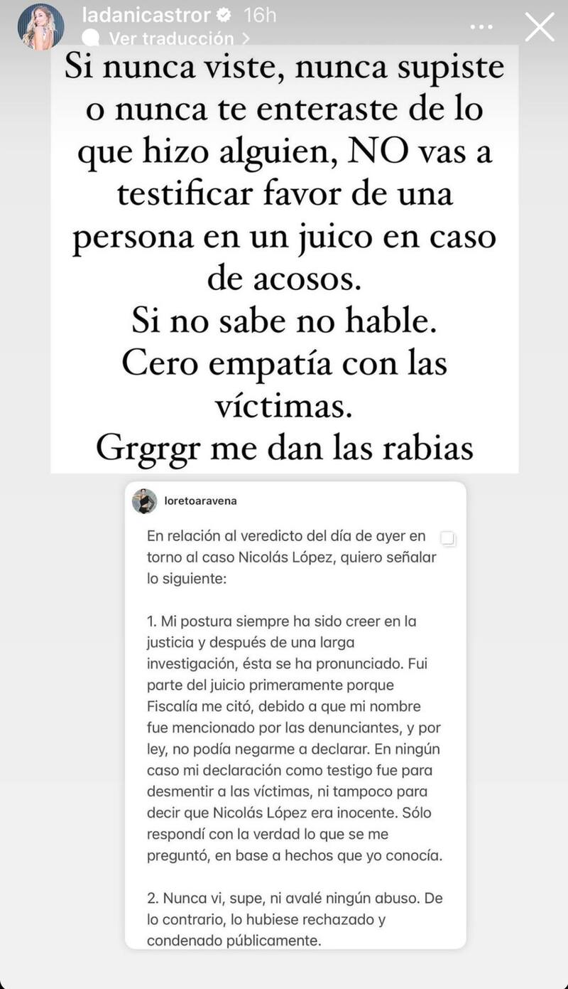 Y ahora, quien salió al paso de sus dichos fue Daniela Castro, quien también utilizó su cuenta de Instagram para criticar a Aravena.