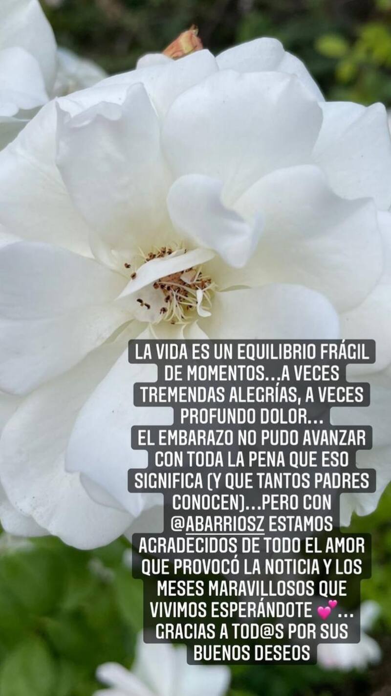 “La vida es un equilibrio frágil de momentos. A veces profundo dolor. El embarazo no pudo avanzar con toda la pena que eso significa (y que tantos padres conocen). Estamos agradecidos de todo el amor que provocó la noticia y los meses maravillosos que vivimos esperándote. Gracias a tod@s por sus buenos deseos”.