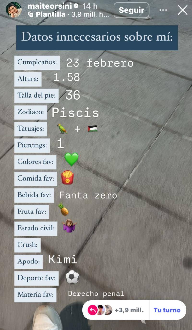 “Datos innecesarios sobre mí”, señaló en sus historias de la popular plataforma, agregando un listado de preferencias como por ejemplo: