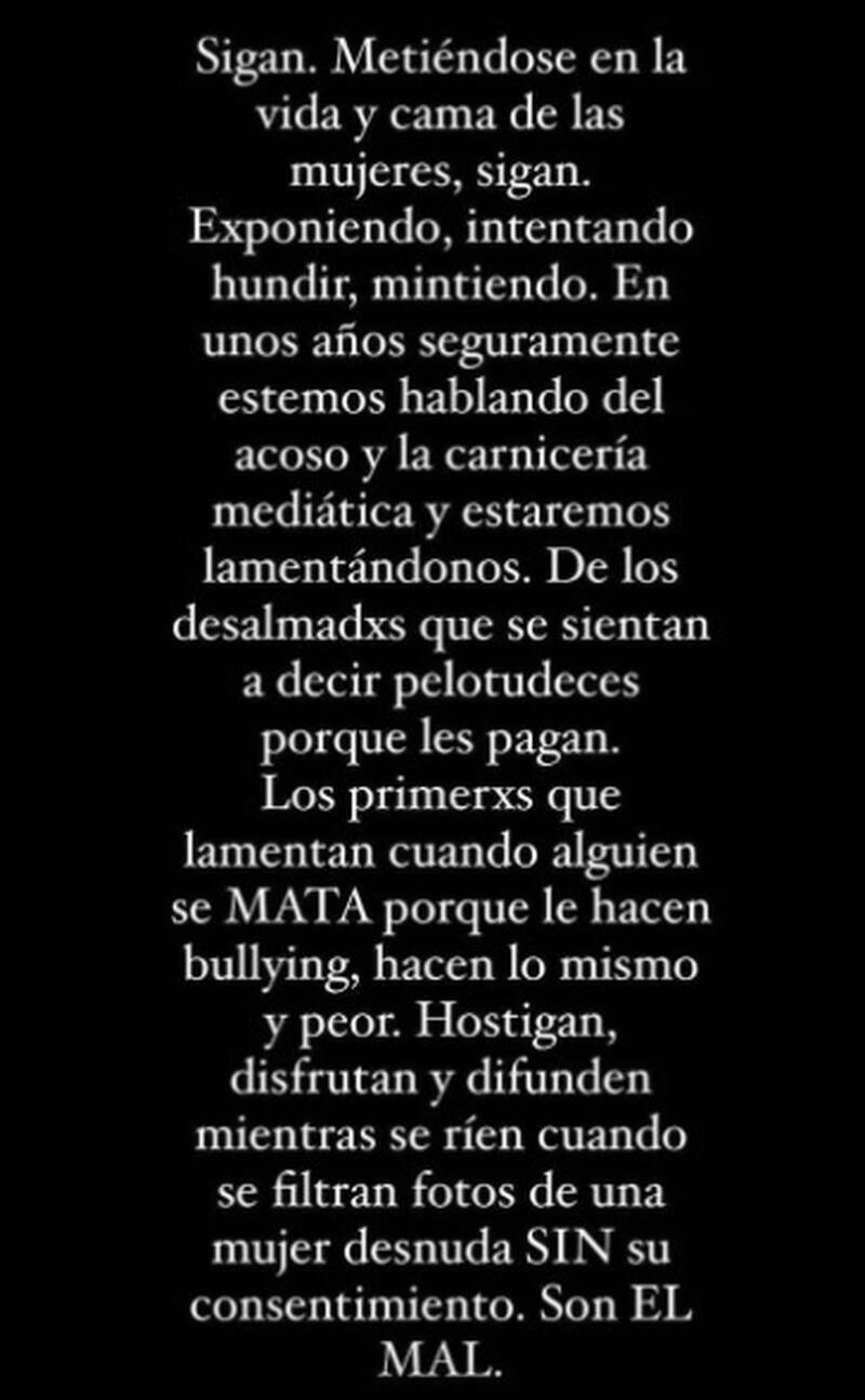 “Sigan. Metiéndose en la vida y cama de las mujeres, sigan. Exponiendo, intentando, hundir, mintiendo”, comenzó el mensaje que dejó en sus historias de Instagram.