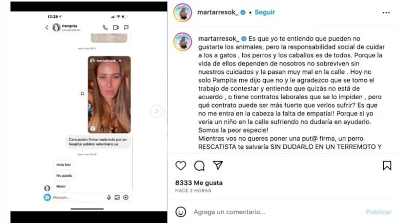 El intercambio de mensajes fue a través de los directos de Instagram, Mar le escribió: “Caro, ¿podés firmar nada más por un hospital público veterinario ya?”.