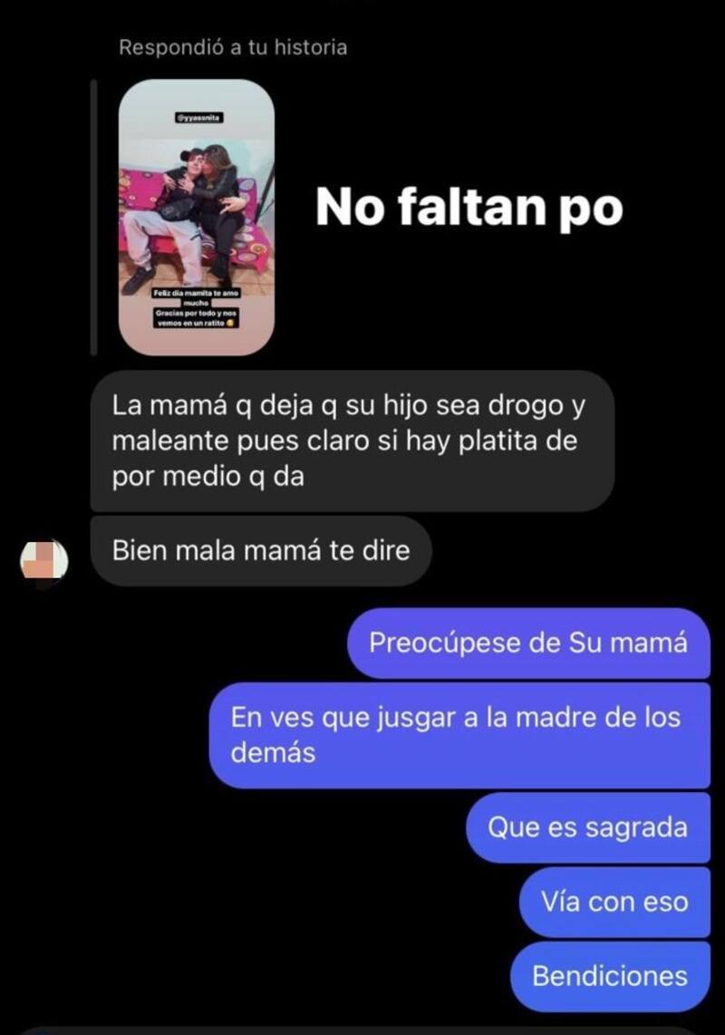 “La mamá que deja que su hijo sea drogo y maleante pues claro si hay platita de por medio que da. Bien mala mamá te diré”, le escribió.