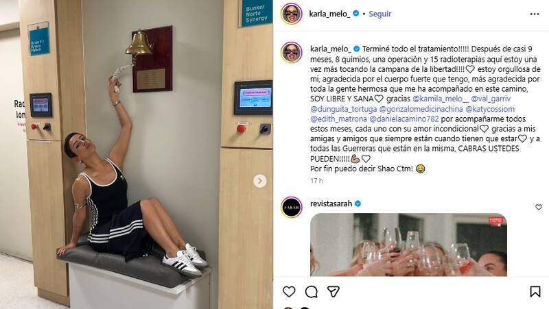 “Terminé todo el tratamiento!!!!! Después de casi 9 meses, 8 quimios, una operación y 15 radioterapias aquí estoy una vez más tocando la campana de la libertad!!!!”, escribió en la publicación.