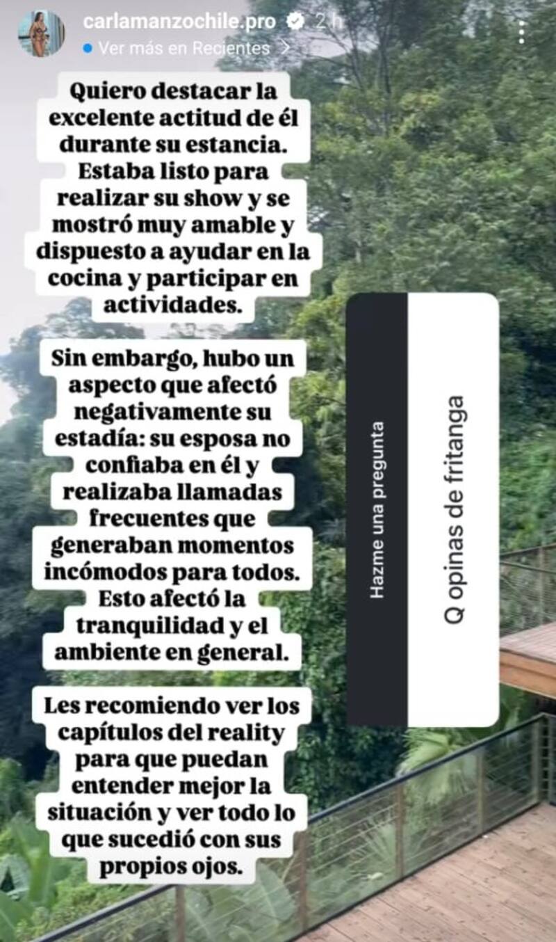 “Sin embargo, hubo un aspecto que afectó negativamente su estadía: su esposa no confiaba en él y realizaba llamadas frecuentes que generaban momentos incómodos para todos. Esto afectó la tranquilidad y el ambiente en general”, escribió.