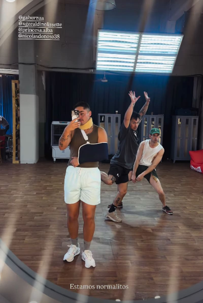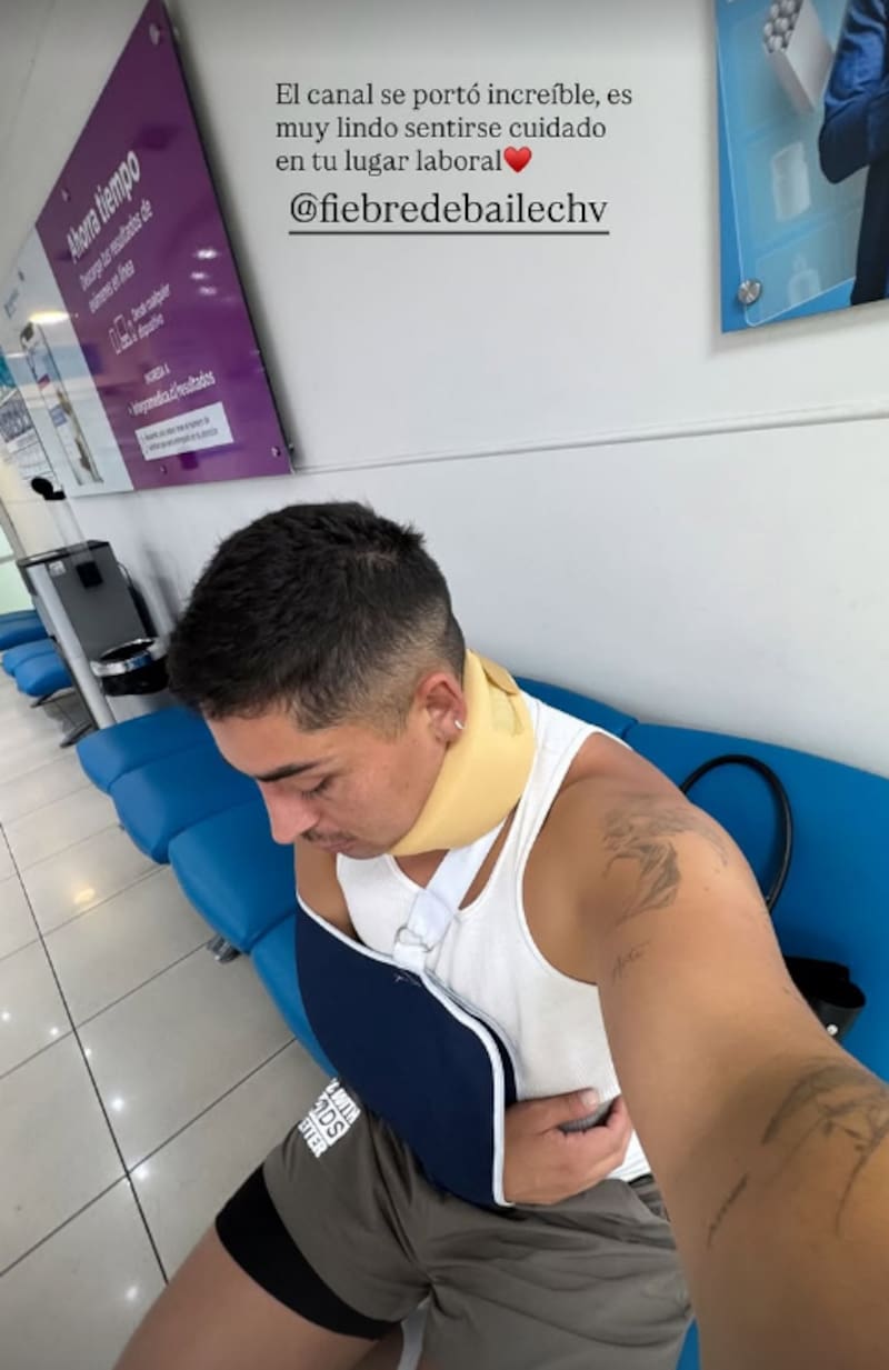 En las fotos que el bailarín compartió se le ve con un cuello ortopédico y un cabestrillo, al interior de un centro asistencial.