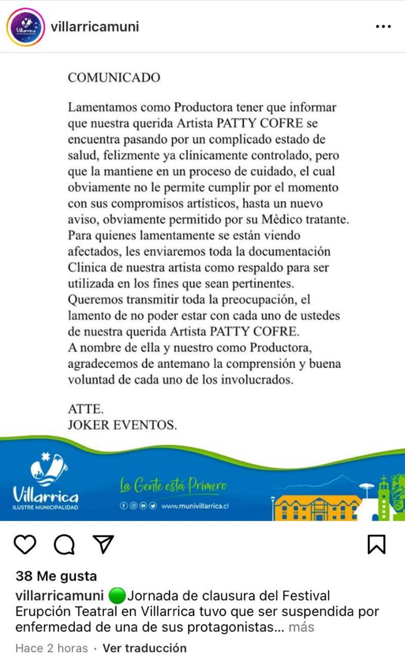 La Municipalidad de Villarrica anunció a través de un comunicado la suspensión del show de la comediante Paty Cofré, debido a un problema de salud.