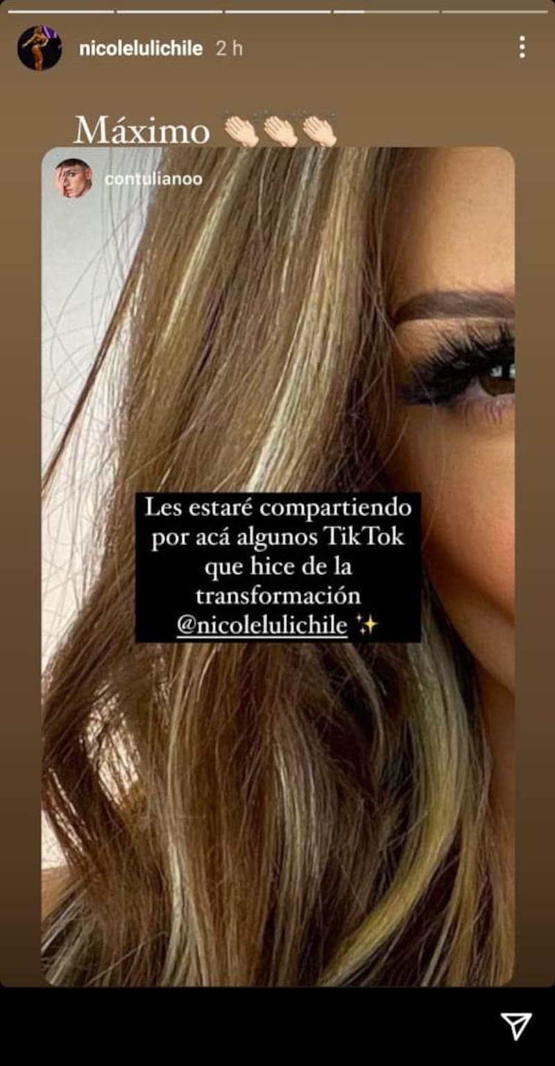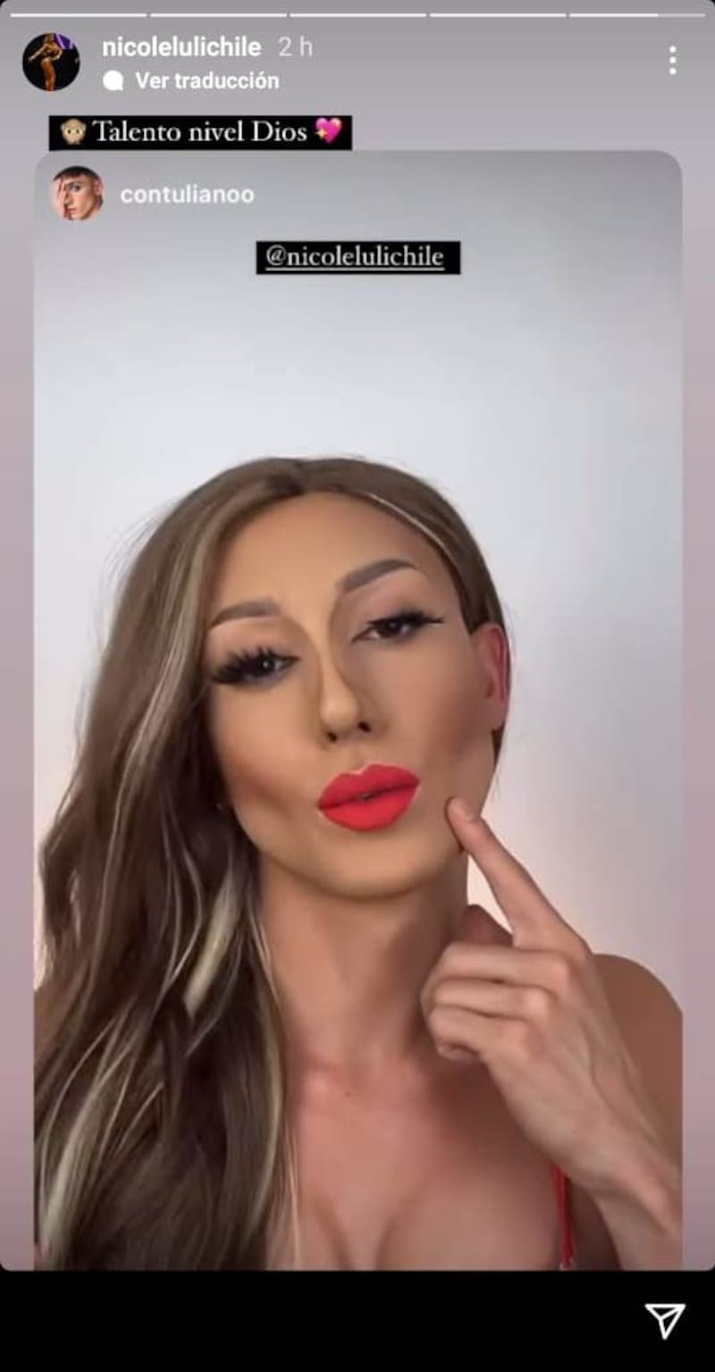A través de sus historias de Instagram, la modelo fitness compartió el trabajo de “Contuliano”, un joven titkoker chileno y maquillador quien recrea diversos looks de mujeres de la farándula nacional luciendo idéntico a ellas.