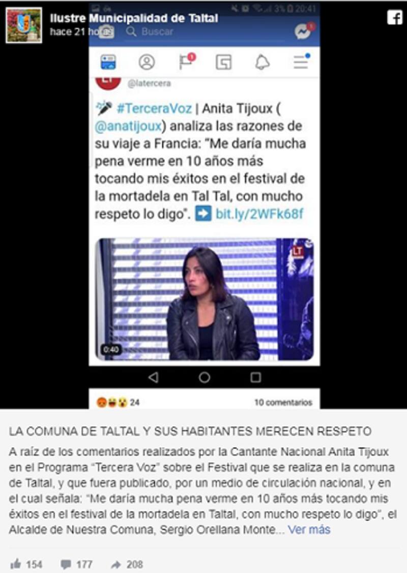 También agregó que "la artista antes mencionada, no recuerda o se olvida de que varios artistas de cobertura nacional, entre ellas, la propia cantante Anita Tijoux, han llegado a las actividades que como comuna organizamos, y ello ha de uno u otro modo, ha sido un impulso en su carrera".