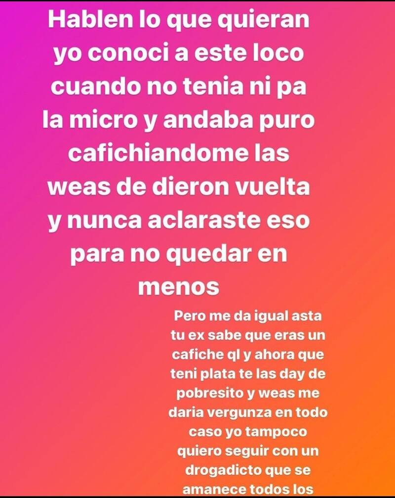 “Las cosas no son así, soy joven tengo un futuro y jamás me dejaste brillar a tu lado, porque tu mamá te metía we… en la cabeza, machista de mier… Hablen lo que quieran, yo conocí a este loco cuando no tenía ni pa’ la micro y andaba puro caficheandome. Las we… se dieron vuelta y nunca aclaraste eso para no quedar en menos”, señaló.
