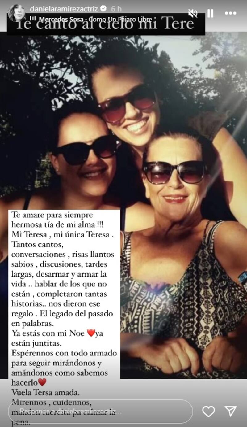 “¡Te amaré para siempre, hermosa tía de mi alma! Mi Teresa, mi única Teresa. Tantos cantos, conversaciones, risas, llantos sabios, discusiones, tardes largas, desarmar y armar la vida”, expresó Daniela en su cuenta de Instagram.