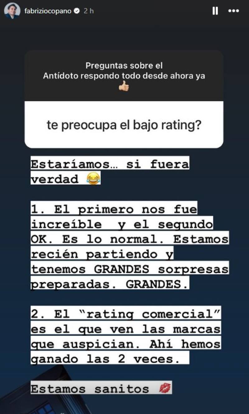 Un usuario de Instagram le preguntó a Copano por este descenso, a través de Instragram. “¿Te preocupa el bajo rating?”, le consultó al hueso.